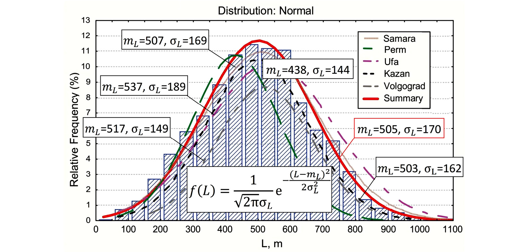 Fig. 5. Distribution of lengths of distances L, m, typical for urban electric transport