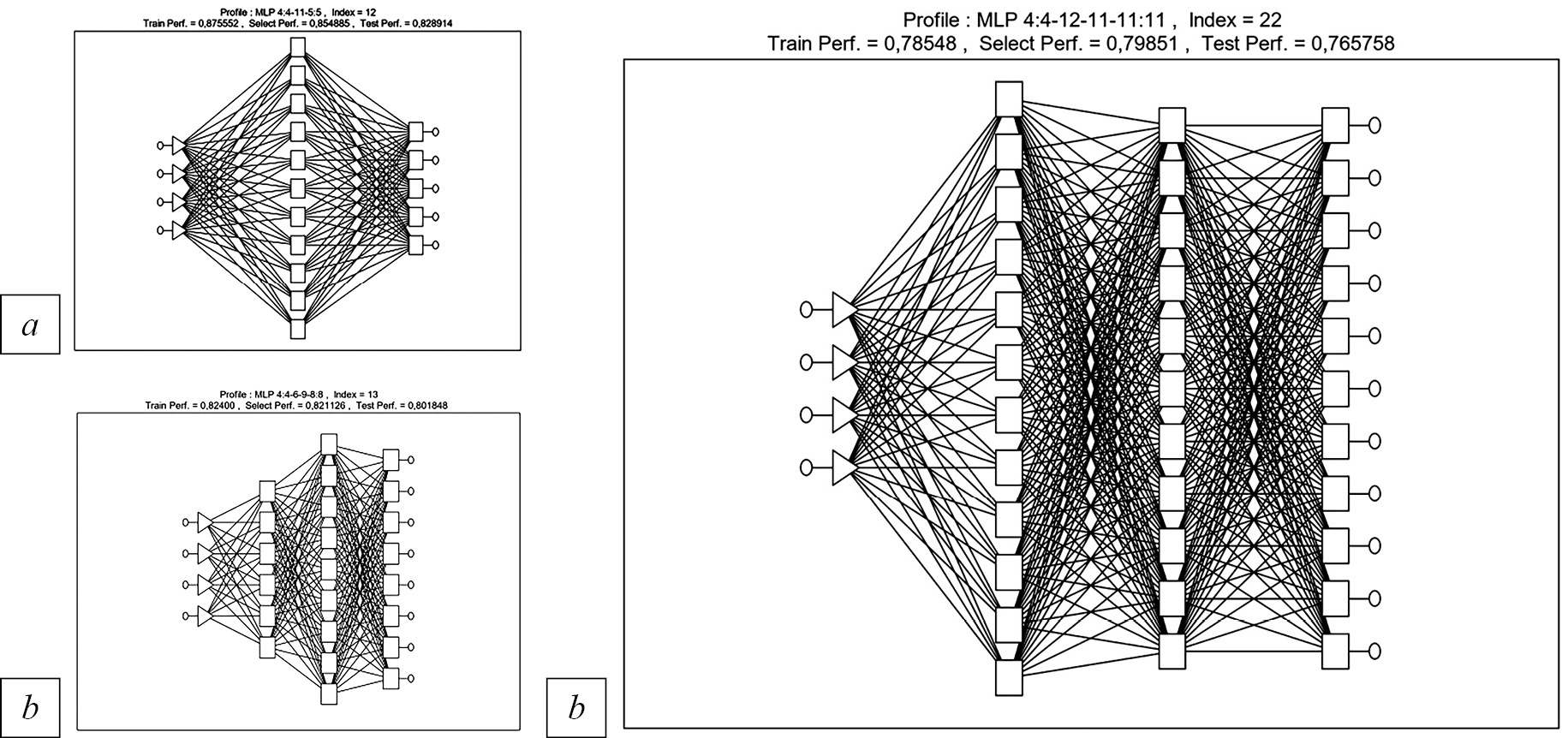 Fig. 6. Neural networks based on multilayer perceptron: MLP 4-11-5 (а); MLP 4-6-9-8 (б); MLP 4-12-11-11 (в)