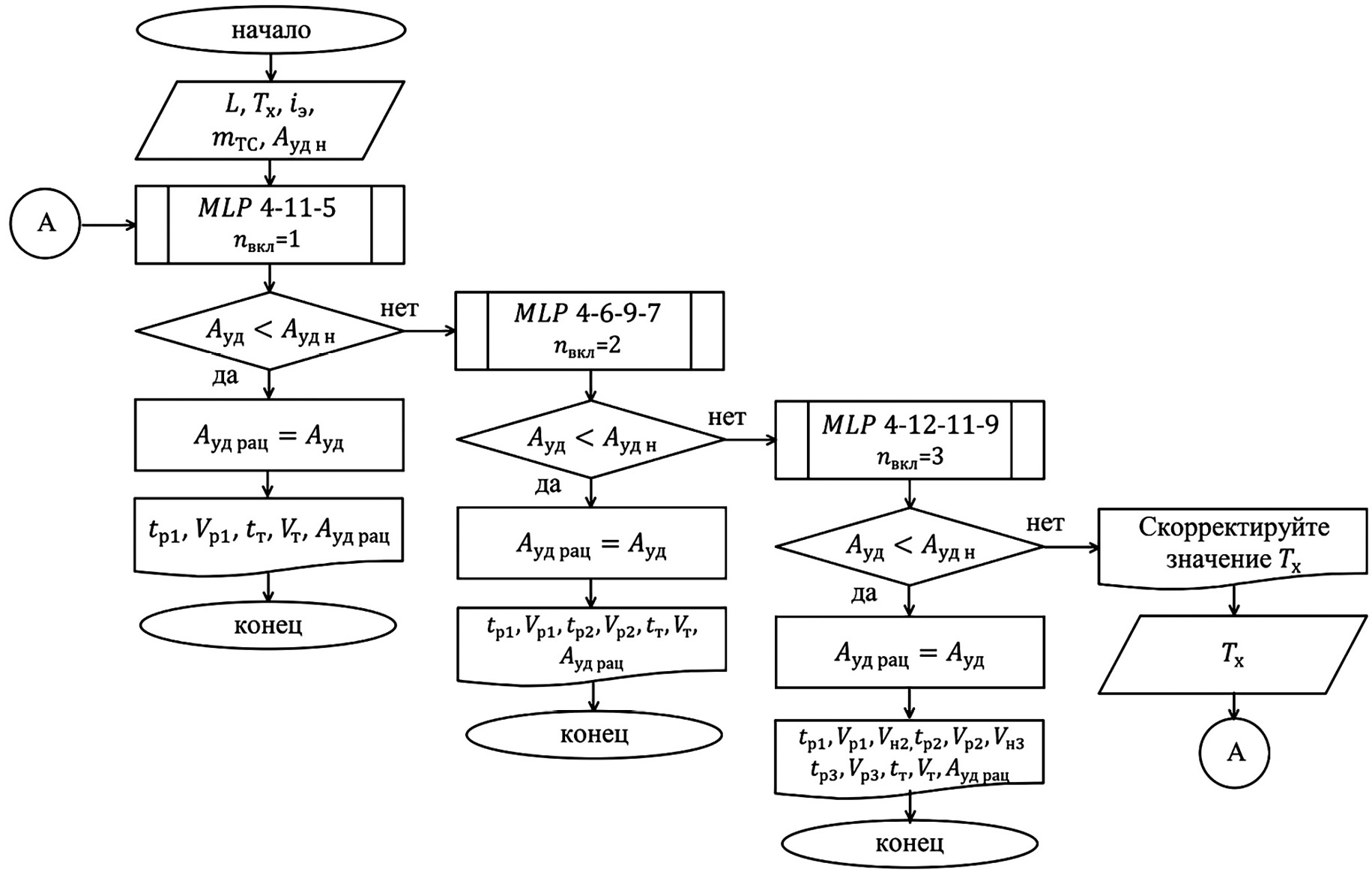Таким образом, общий алгоритм может быть реализован на основании трех нейронных сетей для «частных» задач определения параметров эффективного управления электротехническим комплексом ТЭО при количестве включений от 1 до 3 на заданном перегоне.