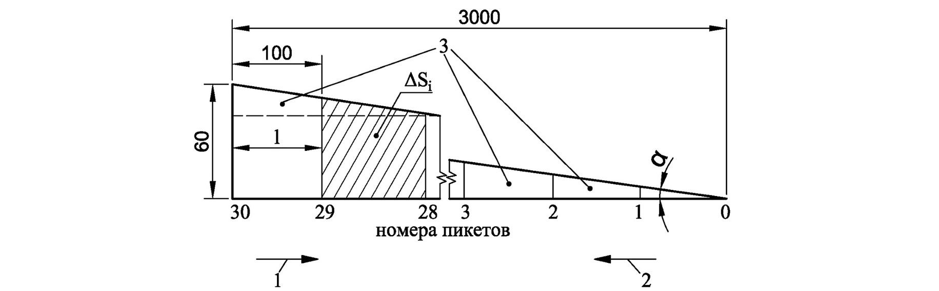 Объектом исследования в данной работе является клиновидный блок, схема отработки которого приведена на Рис. 1. Клиновидный блок разбивается на условные участки, границы которых обозначены пикетами (Рис. 2). Расстояние между пикетами должно быть в пределах 50–100 м, что обеспечивает, по нашему мнению, достаточную точность расчетов. В данной работе количество участков принято равным 30 единицам, расстояние между пикетами равно 100 м. Высота уступа (h) составляет 10 м. Площадь каждого элементарного участка определяется по методике, приведенной в работе [2]. При изучении рассматривается порядок разработки клиновидных блоков экскаваторно-автомобильными комплексами двумя вариантами: