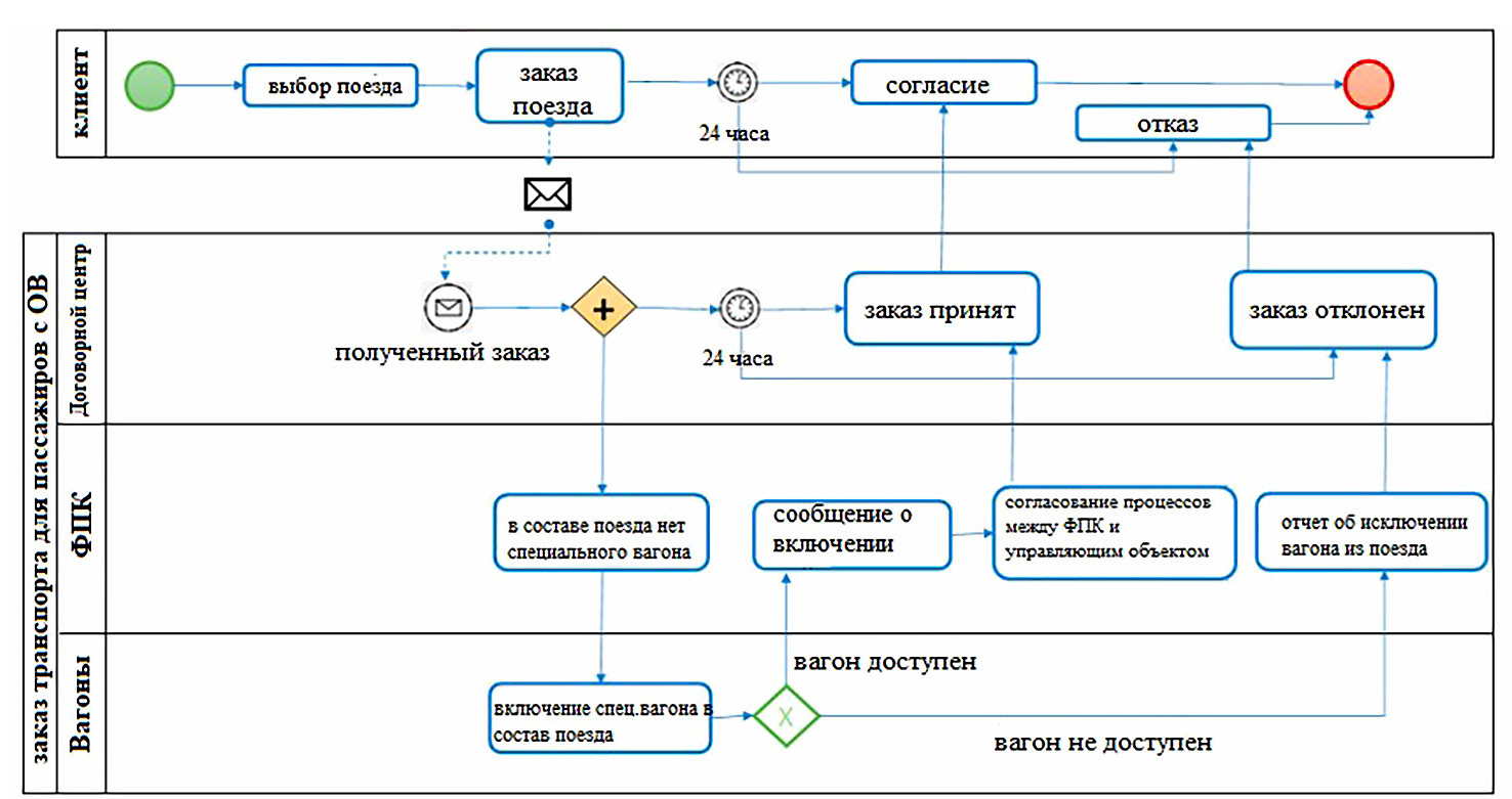 Весь процесс представлен графически на Рис. 6, зеленый и красный круги показывают начало и конец процесса, конверт – момент получения заказа контактным центром мобильности, желтый ромб – ожидание завершения параллельных процессов, зеленый ромб – возможность доступности специального вагона.