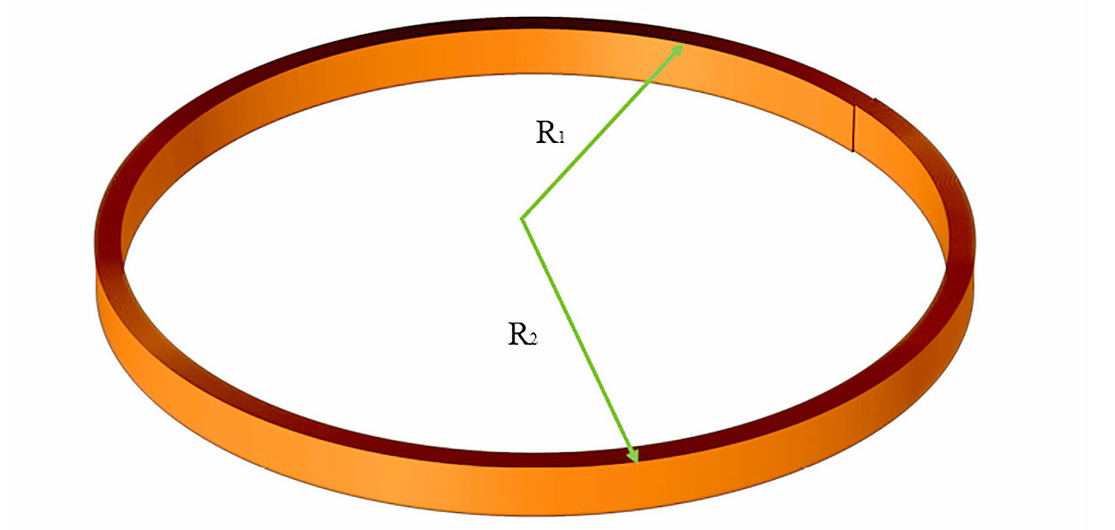В рамках настоящей работы исследованы магнитные и транспортные характеристики двух типов ВТСП катушек: рейстрек-катушки и круговые обмотки. Принципиальная схема рейстрек-катушки представлена на Рис. 1. Рейстрековая катушка представляет из себя послойную спиралевидную намотку проводника на формер, содержащий два скругленных участка и два параллельных линейных участка. Длина прямого участка катушки L, внутренний радиус R1 внешний радиус R2 = R1 + n∙h, где n – число витков обмотки, h – толщина одного слоя обмотки. Круговая ВТСП обмотка с математической точки зрения является идеальной спиралью Архимеда (Рис. 2). Длина L линейного участка рейстрек-катушки составляет 80 мм, малый радиус R1=20 мм. Малый радиус кольцевой незамкнутой ВТСП обмотки R1=30 мм. Количество n ВТСП слоев обмоток при моделировании варьируется от 1 до 40. Для проведения вычислений использовалась геометрия, дублирующая геометрию катушек, изготовленных для проведения экспериментальных исследований.