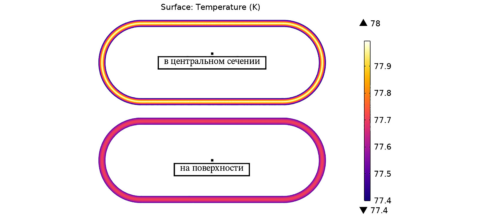 Некоторые различия были также выявлены и в тепловом поведении этих двух видов обмоток. На Рис. 5 и 6 соответственно приведены распределения температур в центральном сечении и на поверхности для рейстрек-катушки и кольцевой обмотки, содержащих 40 слоев ВТСП ленты и охлаждаемых жидким азотом при пропускании транспортного тока величиной 85 А. В обоих случаях максимальному нагреву подвержены средние слои обмоток, контактирующие с хладагентом только с торцов и окруженные, к тому же, другими токонесущими греющимися ВТСП лентами. Однако максимальный нагрев лент в рейстрек-катушке составил ~ 0,6 К, а ВТСП элементы кольцевой обмотки изменили температуру на 1,7 К.
