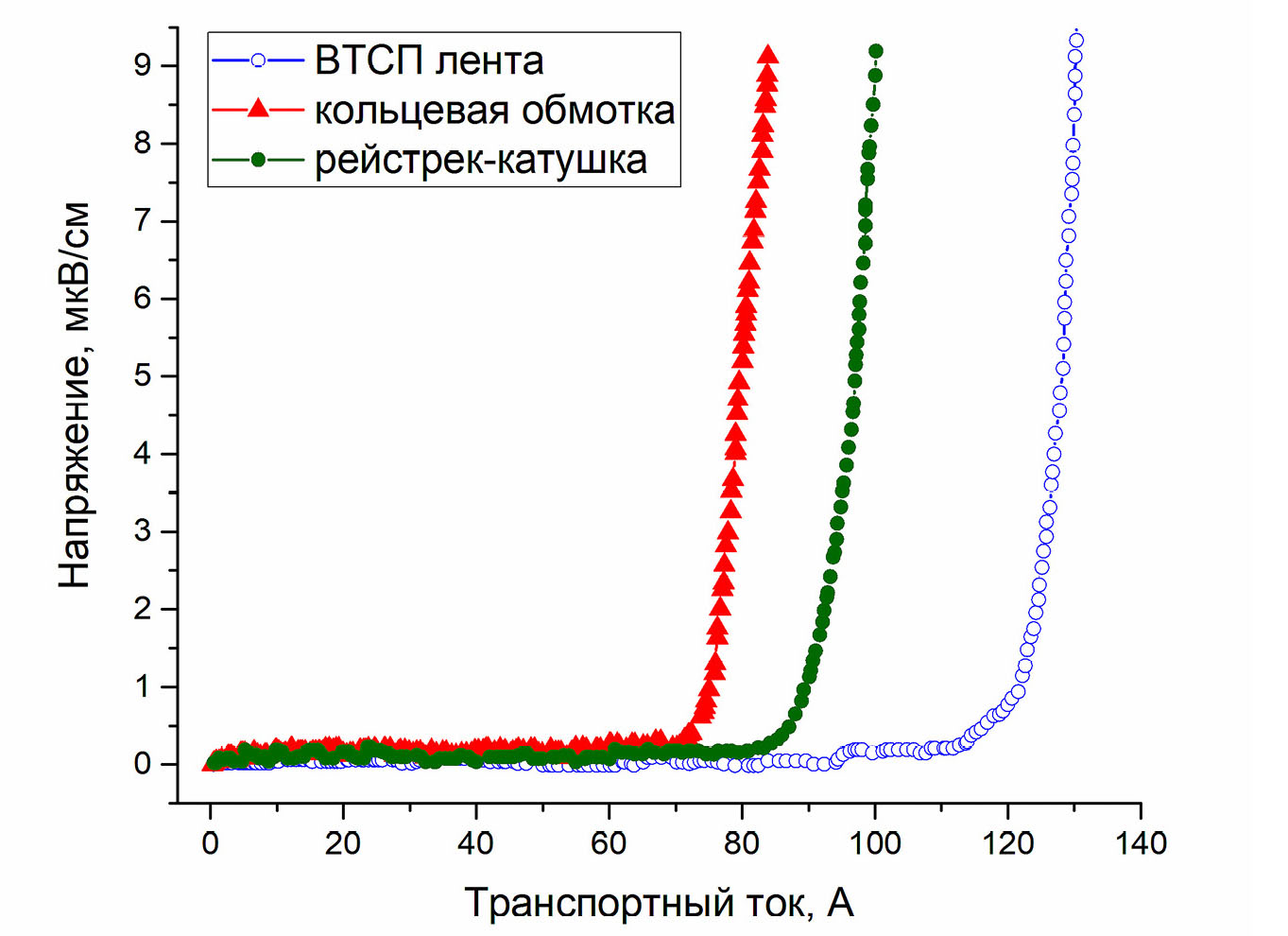 Таким образом, установлено, что в условиях охлаждения жидким азотом рейстрек-катушки обладают более высокими магнитными и транспортными характеристиками в сравнении с замкнутыми кольцевыми ВТСП элементами, на что решающее влияние оказывает их геометрический фактор. Наиболее выгодной конфигурацией обмотки элементов ВТСП генератора при азотном охлаждении является рейстрековая катушка.