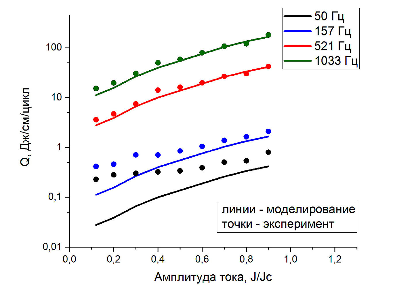 Расчет потерь на переменном токе выполнен для различных частот и амплитуд токовой нагрузки. Частота переменного тока соответствует условиям проведения экспериментальных исследований, в рамках которого во избежание дополнительных наводок от электрических сетей, помимо частоты 50 Гц, исследовались частоты, не кратные 50. На Рис. 8 и Рис. 9 приведены расчетные и экспериментальные зависимости потерь на переменном токе соответственно в рейстрек-катушке и кольцевой обмотке за цикл нагрузки от величины токовой нагрузки для различных частот переменного транспортного тока. Результаты численного моделирования с хорошей точностью согласуются с экспериментальными данными. Потери в круговой обмотке превышают потери в рейстрек-катушках на величину от 7% до 28%, причем это различие увеличивается с ростом частоты переменного тока.