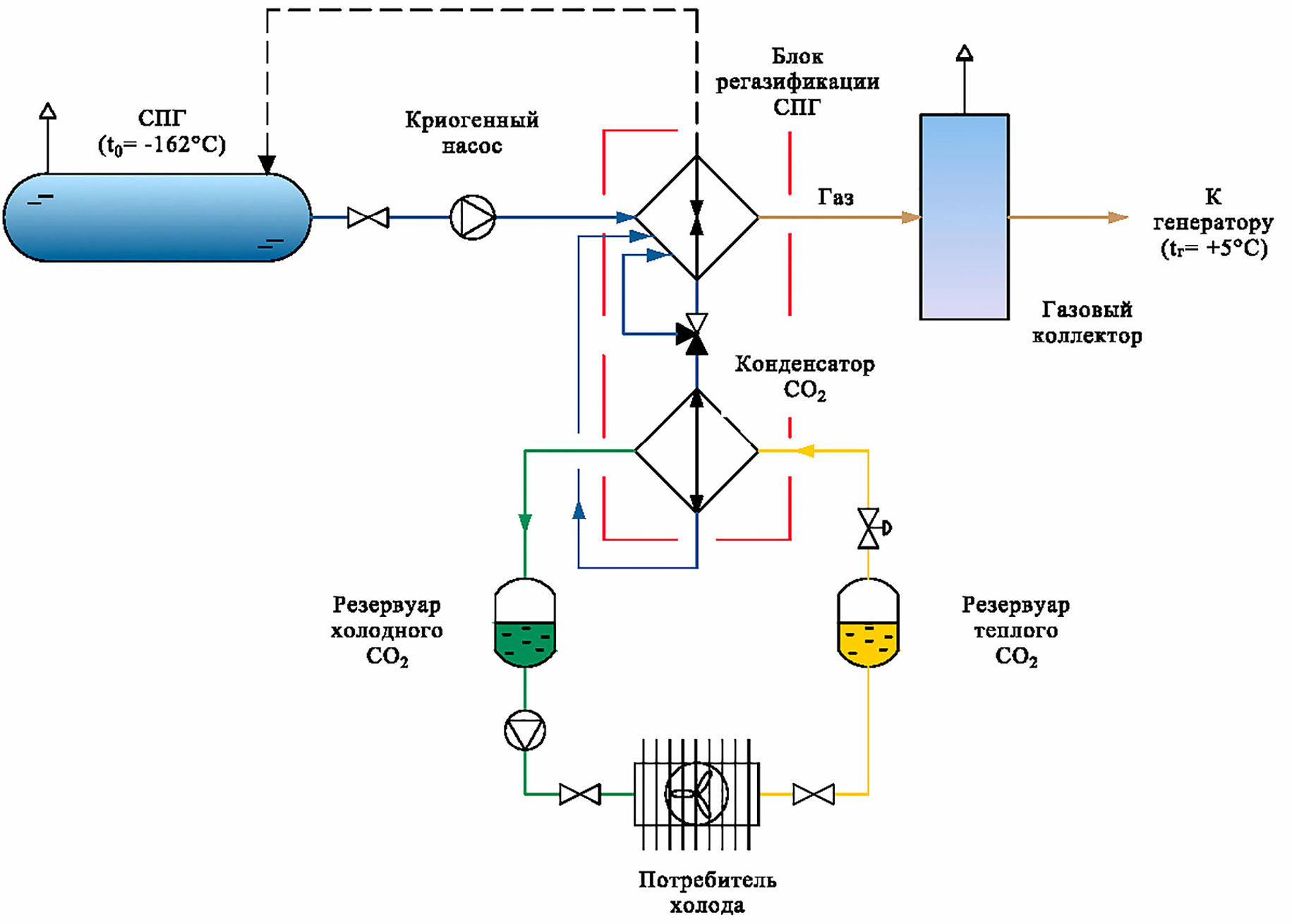 В первом контуре системы производится регазификация СПГ и нагрев топлива от -162°С до 5°С за счет тепловых притоков в спиральновитом теплообменном аппарате. Далее газ собирается в газовый коллектор, затем подается в топливную линию газового генератора. Второй контур нагревает СПГ за счет отвода теплоты от конденсатора диоксида углерода. Для контроля подачи СПГ в систему заложен трехходовой регулирующий клапан. С целью исключения процесса дросселирования жидкой фазы в регулирующем клапане, предполагается отбор СПГ температурой не ниже -120 °С.