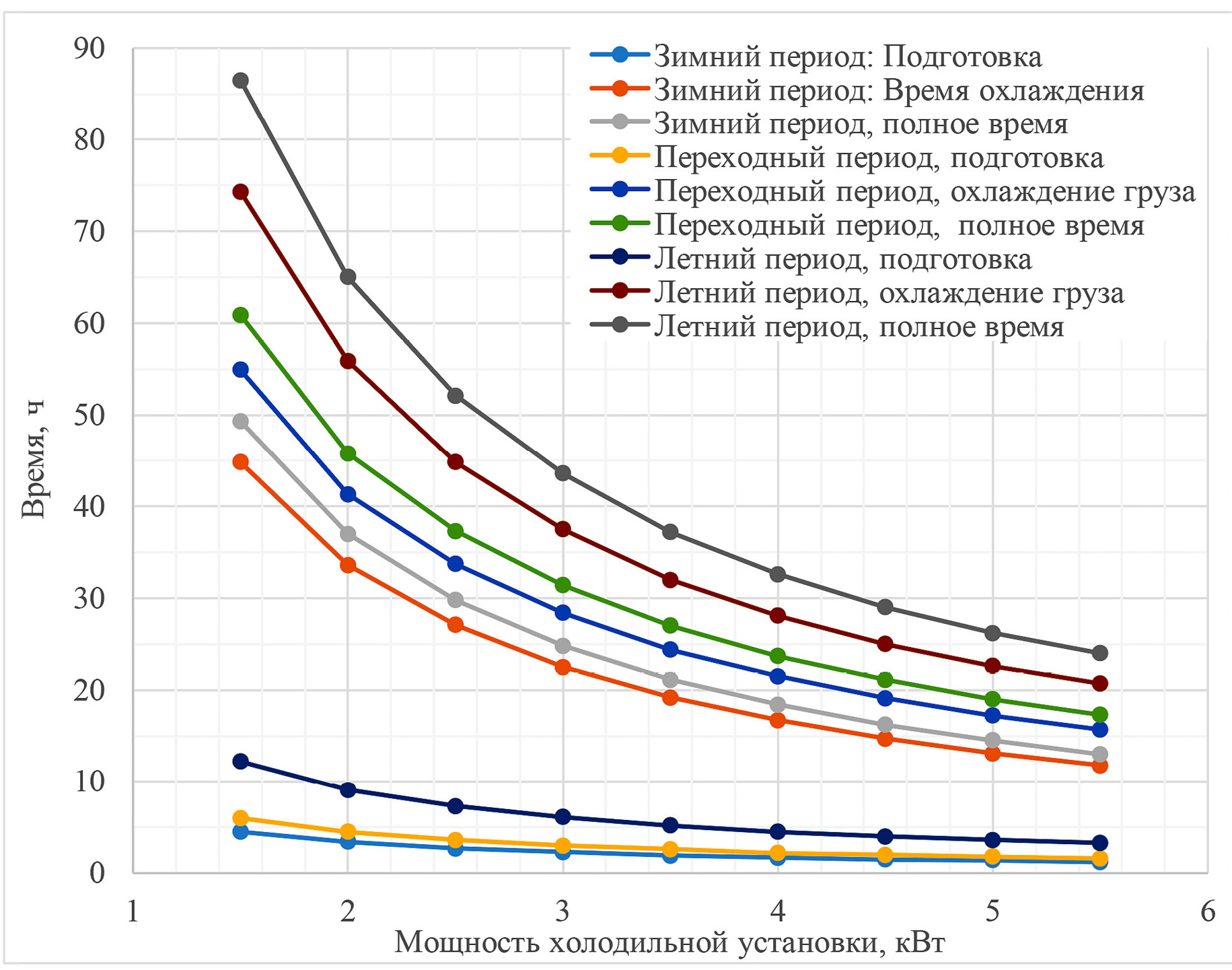 Результаты расчета подтверждают, что использование системы утилизации холода СПГ позволяет значительно сократить время, необходимое для охлаждения рабочего пространства рефконтейнера и перевозимого груза. Наибольший эффект наблюдается в летний период, обеспечивая сокращение подготовки рефконтейнера и охлаждения перевозимого груза до 27% в зависимости от холодопроизводительности системы.