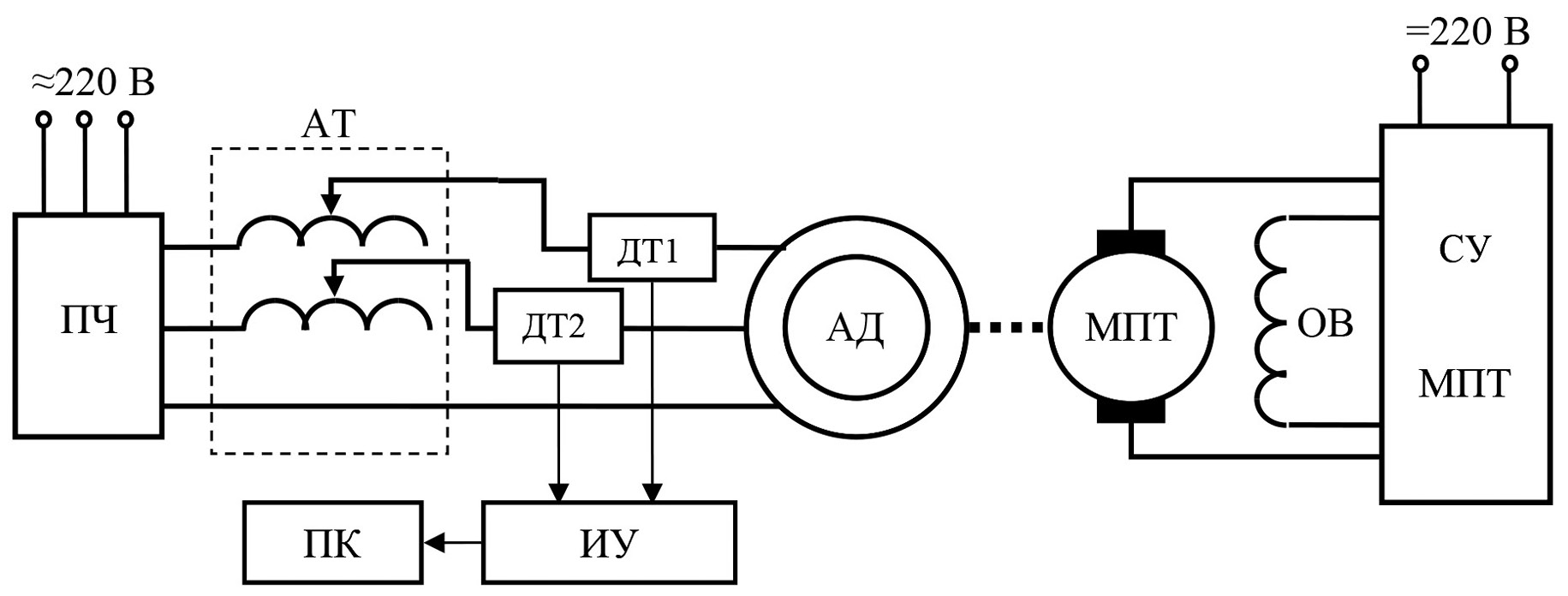 Fig. 1. Experimental setup ПЧ – frequency converter; AT – autotransformer; ДТ1, ДТ2 – current sensors; АД – asynchronous motor; МПТ – direct current machine; ОВ – independent excitation winding of МПТ; СУ МПТ – control system of МПТ; ИУ – measuring device; ПК – personal computer.