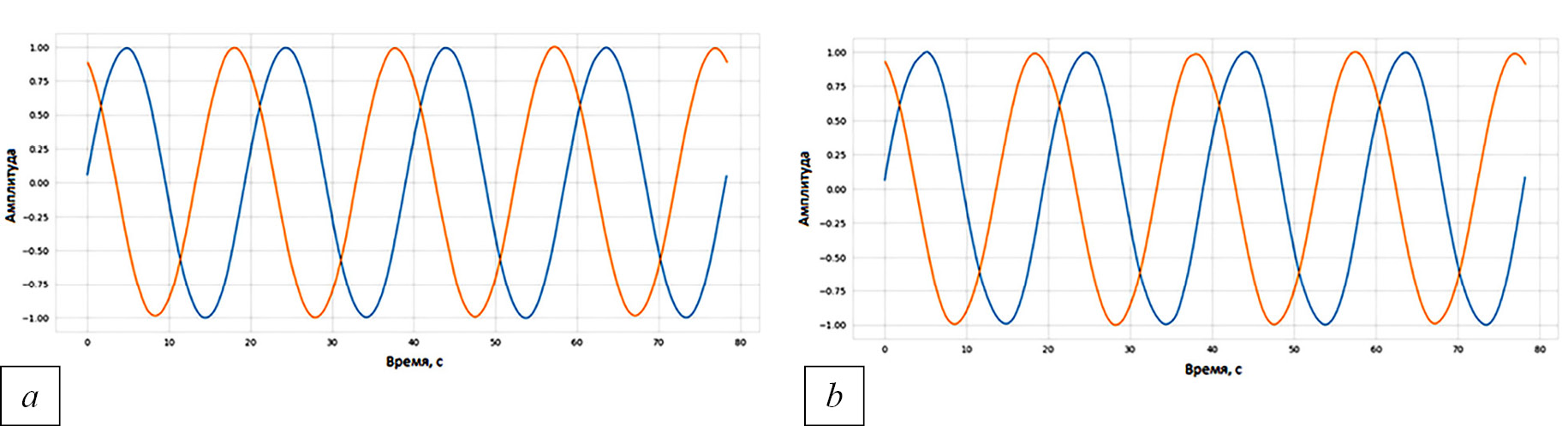 Рис. 4. Вид нормализованных сигналов датчиков тока после фильтрации для различной степени развития межвиткового короткого замыкания: а – короткое замыкание 5% витков; b – короткое замыкания 15% витков