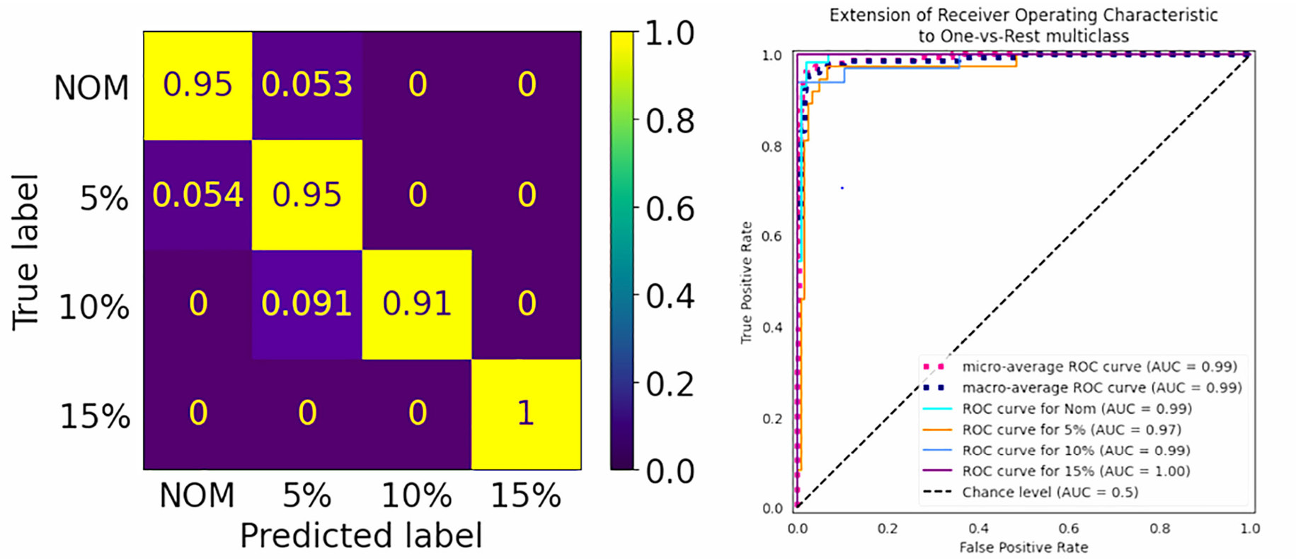 Для решения поставленной задачи наиболее точным оказался метод логистической регрессии (точность 98,5%). ROC кривые (Receiver Operating Characteristics), которые показывают насколько хорошо модель машинного обучения может различать два класса событий, а также матрица ошибок, показывающая количество правильных и ошибочных предсказаний для каждого класса при обучении модели на 60% собранных данных, представлены на Рис. 5.