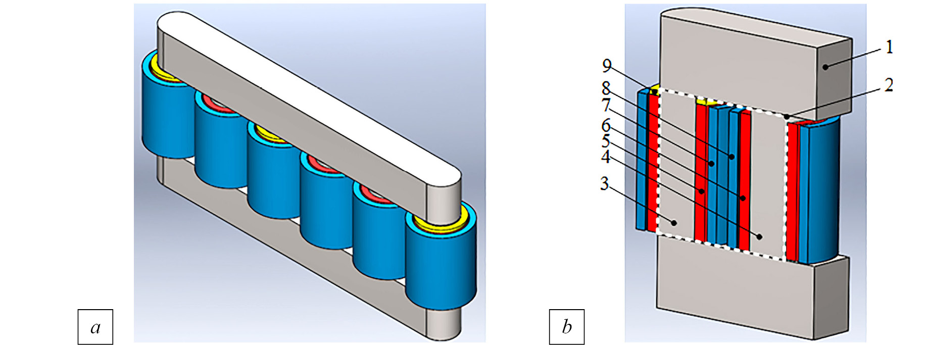 Конструкция трехфазного трансформатора со стабилизирующими свойствами [5] также представлена на Рис. 1, где 1 – ярмо, 2 – расщепленный стержень, 3 и 4 – подстержни, 5 и 6 – секции первичной обмотки, 7 и 8 – секции вторичной обмотки, 9 – короткозамкнутая обмотка. Материалом магнитопровода трансформатора выбрана электротехническая сталь марки 1514.