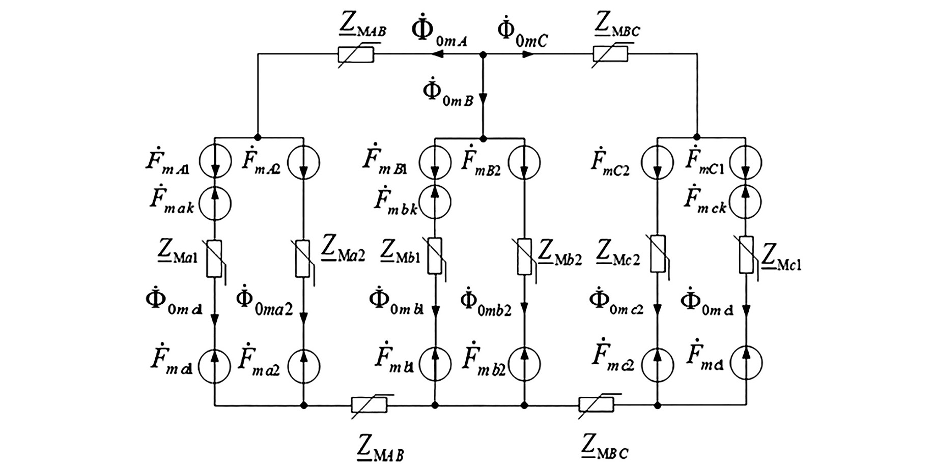 Дальнейшие исследования процессов в обмотках и магнитопроводе трансформатора проведем с использованием схемы замещения его магнитной цепи. Для ее расчета воспользуемся комплексным методом [7, 8]. Для этого несинусоидальные магнитодвижущие силы первичных и вторичных обмоток заменим их эквивалентными синусоидами, участки магнитопровода на схеме представим полными комплексными магнитными сопротивлениями.