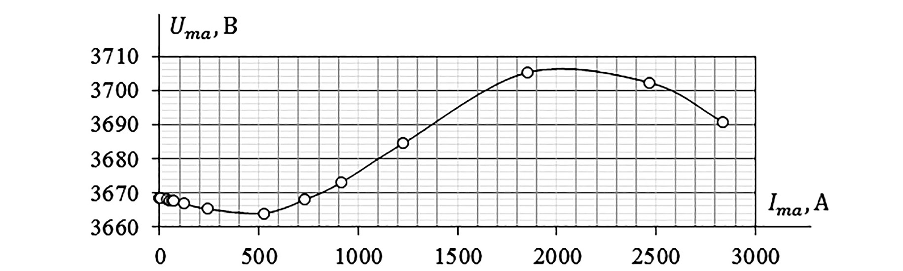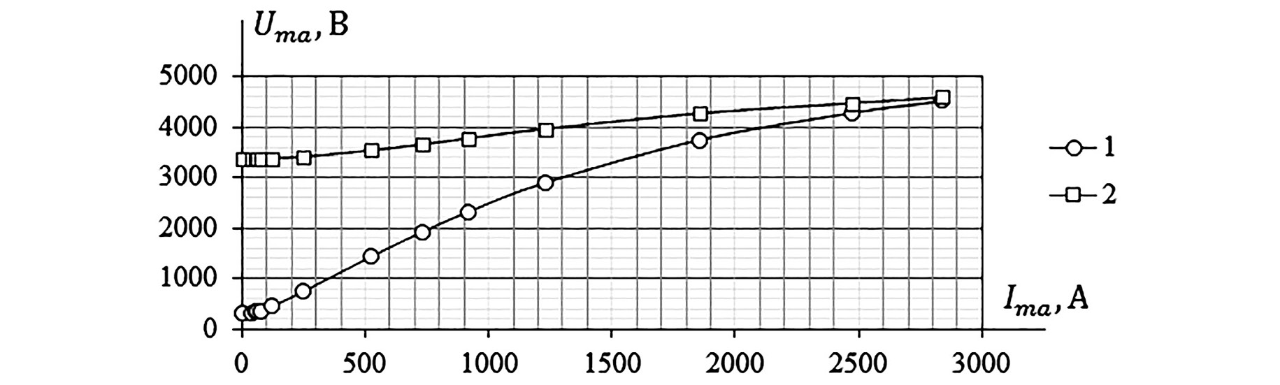 Тогда при амплитудном значении тока вторичной обмотки 2000 А амплитудное значение тока допустимой длительной перегрузки вторичной обмотки трансформатора составит 2400 А. На Рис. 9 представлена внешняя характеристика трансформатора со стабилизирующими свойствами, полученная в результате решения уравнения (8).