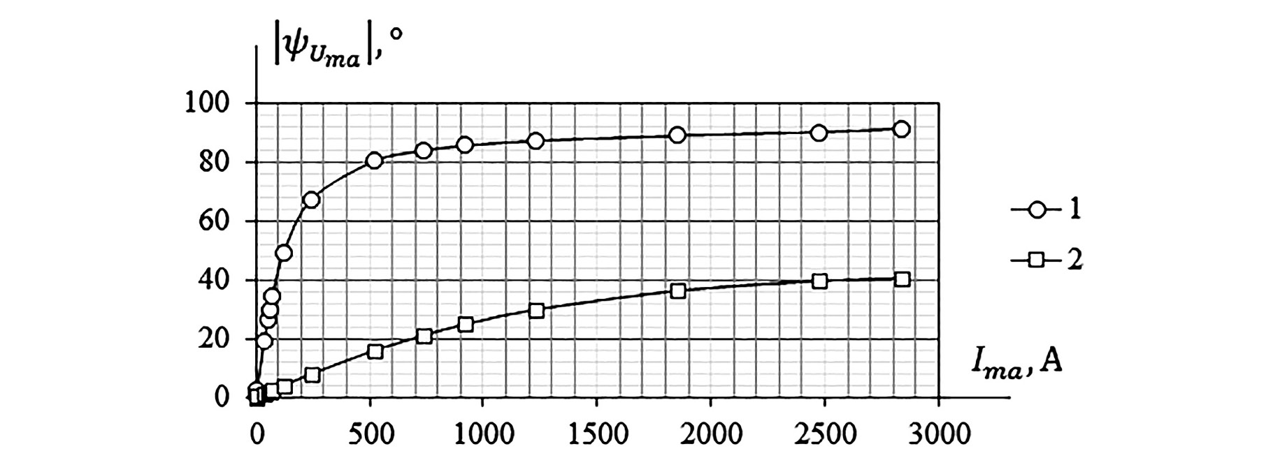 Fig. 5. Current dependencies of the initial phases of the voltages of the secondary winding sections (curve 1 – , curve 2 – )