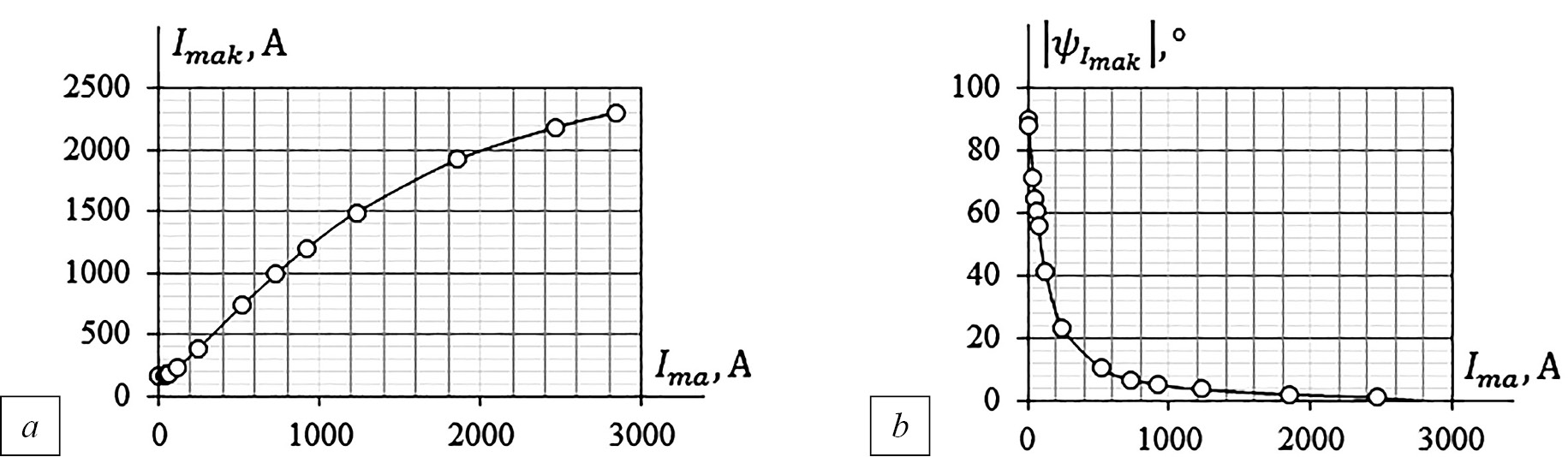 Рис. 6. Зависимость тока короткозамкнутой обмотки a) и его начальной фазы b) от тока вторичной обмотки трансформатора