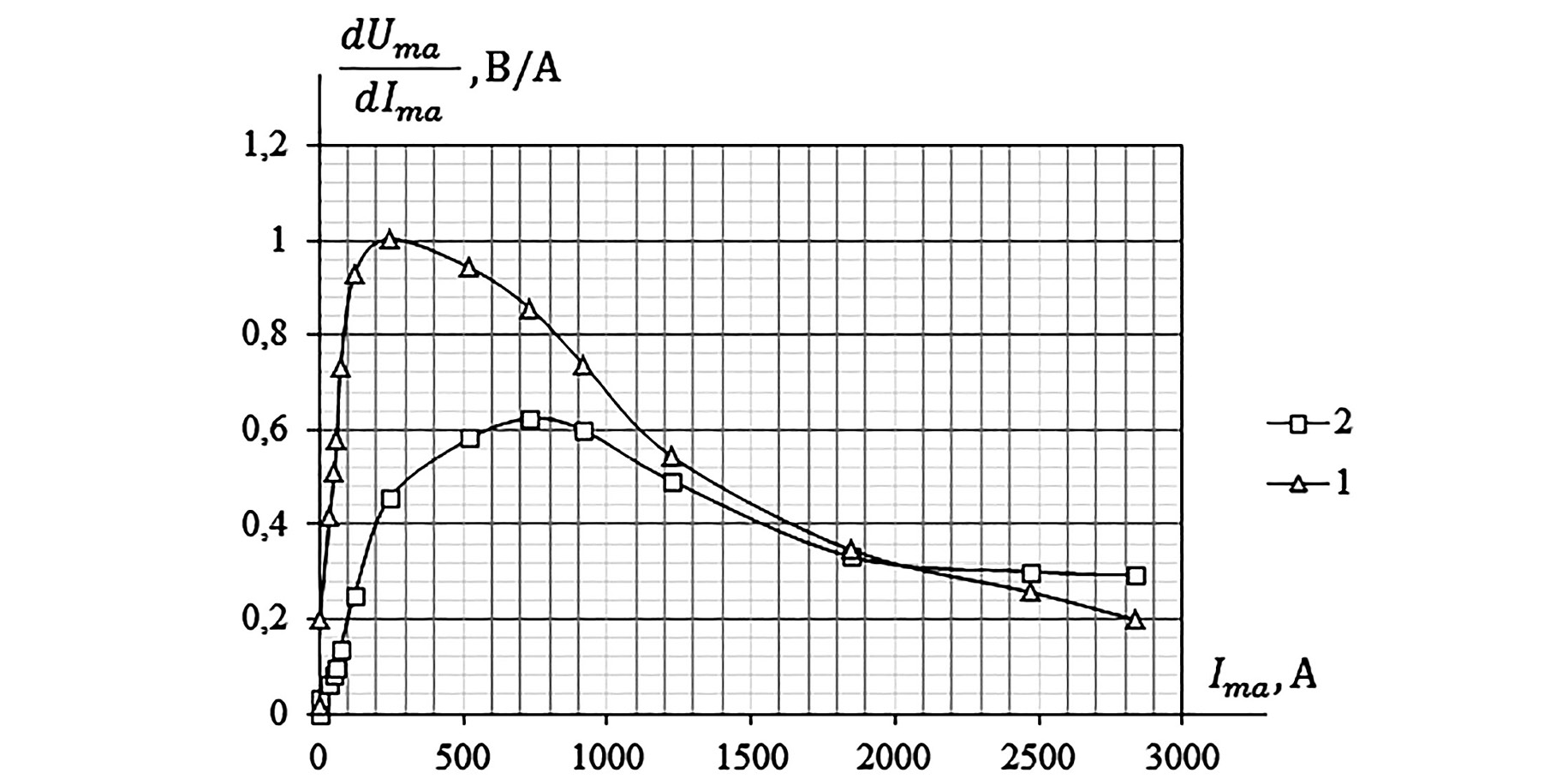 Fig. 7. Current dependences of voltage changes in secondary winding sections (curve 1 – , curve 2 – )