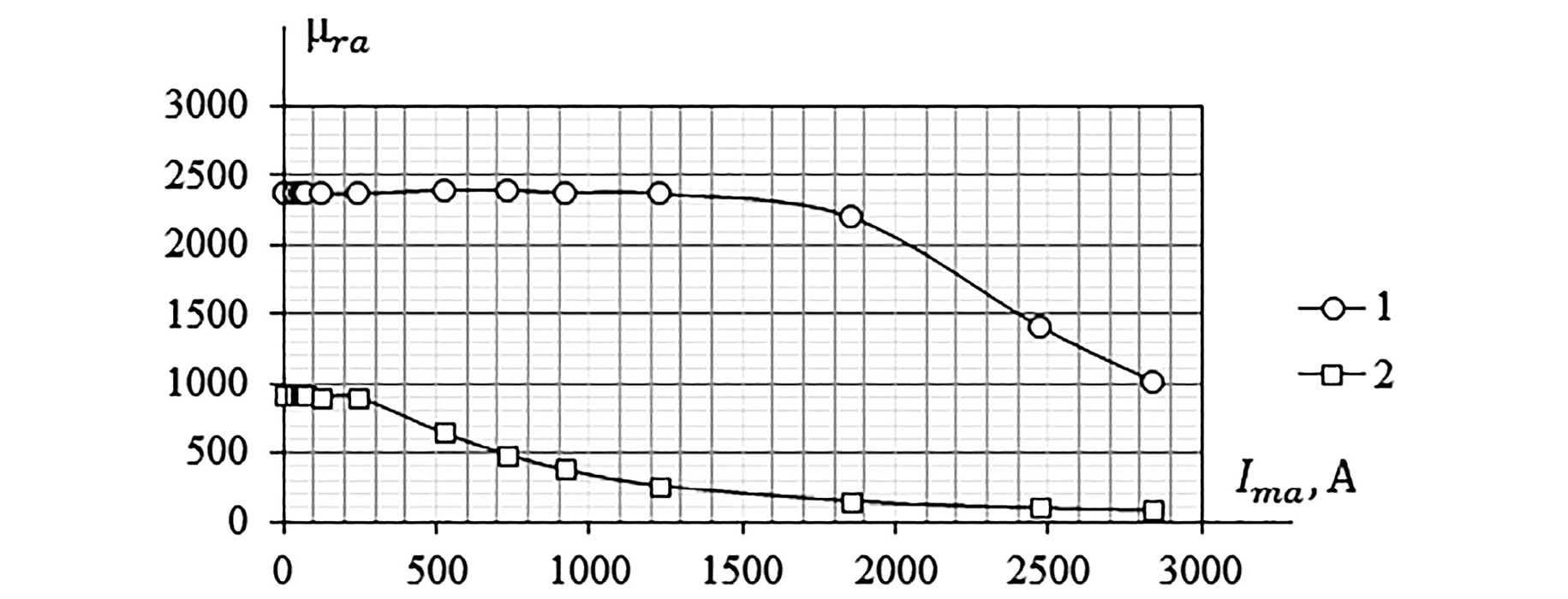 Рис. 8. Относительные магнитные проницаемости материала подстержней (кривая 1 - , кривая 2 - )