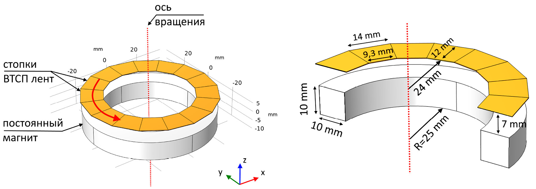 Базовая геометрия опорного сверхпроводящего подшипника с кольцевым постоянным магнитом приведена на Рис. 1. В данной конфигурации магнитный подшипник представляет собой систему, состоящую из статора в виде кольцевого постоянного магнита внутреннего радиуса 25 мм, ширины и высоты 10 мм и ротора в виде стопок композитных ВТСП лент, уложенных в форме многоугольника над поверхностью постоянного магнита. В качестве прототипа сверхпроводящих элементов ротора использованы промышленные ВТСП ленты YBCO ширины 12 мм и толщины 0,1 мм производства российской компании SuperOx [18]. Длинномерная ВТСП лента для реализации ротора разрезается на фрагменты трапецевидной формы, которые укладываются друг на друга, формируя стопки ВТСП лент. Полученные таким образом стопки лент выкладываются над кольцевым постоянным магнитом так, что центр вписанной в полученный многоугольник окружности и центр кольцевого ПМ лежат на оси вращения. Количество ВТСП лент в каждой стопке ротора опорного подшипника составляет 20, так что суммарная толщина ВТСП элемента составляет 2 мм. Минимальная величина левитационного зазора между стопками ВТСП лент и магнитным основанием составляет 7 мм. В каждом из рассмотренных случаев ПМ намагничены вдоль вертикальной оси z.