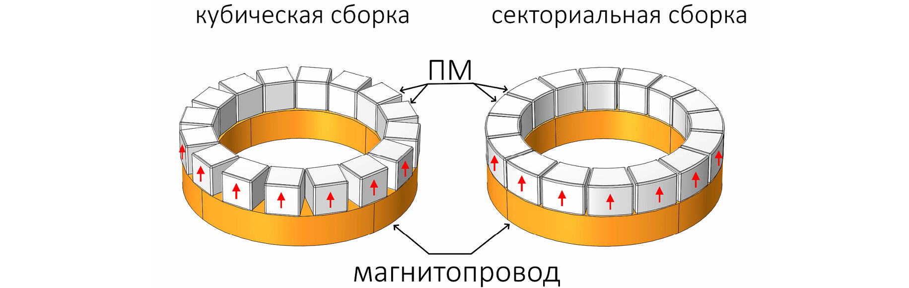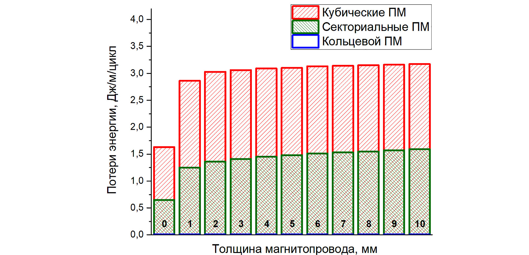 Стоит также отметить, что величины энергетических потерь при использовании секториальных ПМ с магнитопроводом сопоставимы с величиной потерь при использовании кубических постоянных магнитов без магнитопровода. В связи с этим, применение кубических магнитов может быть рекомендовано для сравнительно простых магнитных систем, поскольку такие магниты широко распространены, коммерчески доступны и обеспечивают упрощение производства и сборки за счет стандартных размеров и форм.
