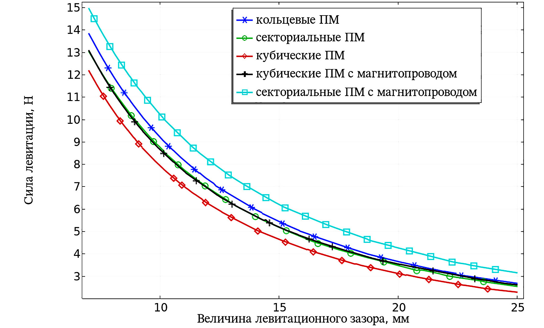 Наименьшие нагрузочные характеристики СМП достигаются при использовании кубических магнитов (на 12% ниже, чем для кольцевого ПМ). Однако при дополнении конструкции магнитопроводом опорная способность такого подшипника становится сопоставима с СМП на основе секториальной сборки ПМ. Наибольшая величина силы магнитной левитации была достигнута при использовании в качестве магнитного основания секториальной сборки ПМ с магнитопроводом. Максимальная сила левитации в такой геометрии оказалась на ~8% выше, чем в эталонной конфигурации СМП с кольцевым магнитом. Более того, использование магнитопровода в комбинации с секториальными постоянными магнитами приводит к тому, что вертикальная составляющая силы левитации такого СМП при любой из исследованных толщин магнитопровода (от 1 мм до 20 мм) выше, чем для эталонной конфигурации с кольцевым магнитом.