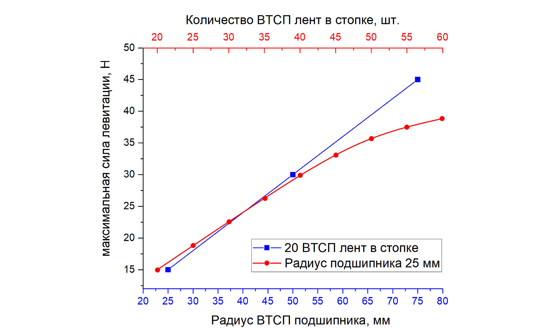 Для оценки потенциала использования различных конфигураций магнитного основания в масштабируемых сверхпроводящих системах был проведен расчет энергетических потерь в ВТСП элементе подшипника при вращении ротора с частотой 2 Гц (Рис. 4). Использование альтернативных конфигураций блока магнитного основания приводит к росту энергетических потерь на порядок в сравнении с геометрией на основе кольцевого ПМ. Кроме того, хорошо видно, что применение конфигураций с магнитопроводом приводит к значительному росту потерь в системе, что связано не только с увеличением внешнего магнитного поля, но и наблюдаемым ростом неоднородности магнитного поля и его влиянием на эффекты перемагничивания в ВТСП материале. Например, количество потерь на цикл для секториальной геометрии магнитного основания оказалось в ~2,5 раза ниже, нежели в аналогичной конфигурации с магнитопроводом высоты 10 мм. Вместе с тем, прирост силы левитации при использовании магнитопровода в этой конфигурации составил всего 14% (Рис. 3). Полученный результат свидетельствует о том, что релевантность применения секториальных ПМ с магнитопроводом может быть достигнута при масштабировании ВТСП подшипника путем увеличения его радиуса вместе с количеством ПМ или же добавления количества ВТСП лент в стопках (Рис. 5). При этом при увеличении радиуса СМП и количества ПМ сила левитации в системе возрастает линейно при том же количестве ВТСП лент в стопке.