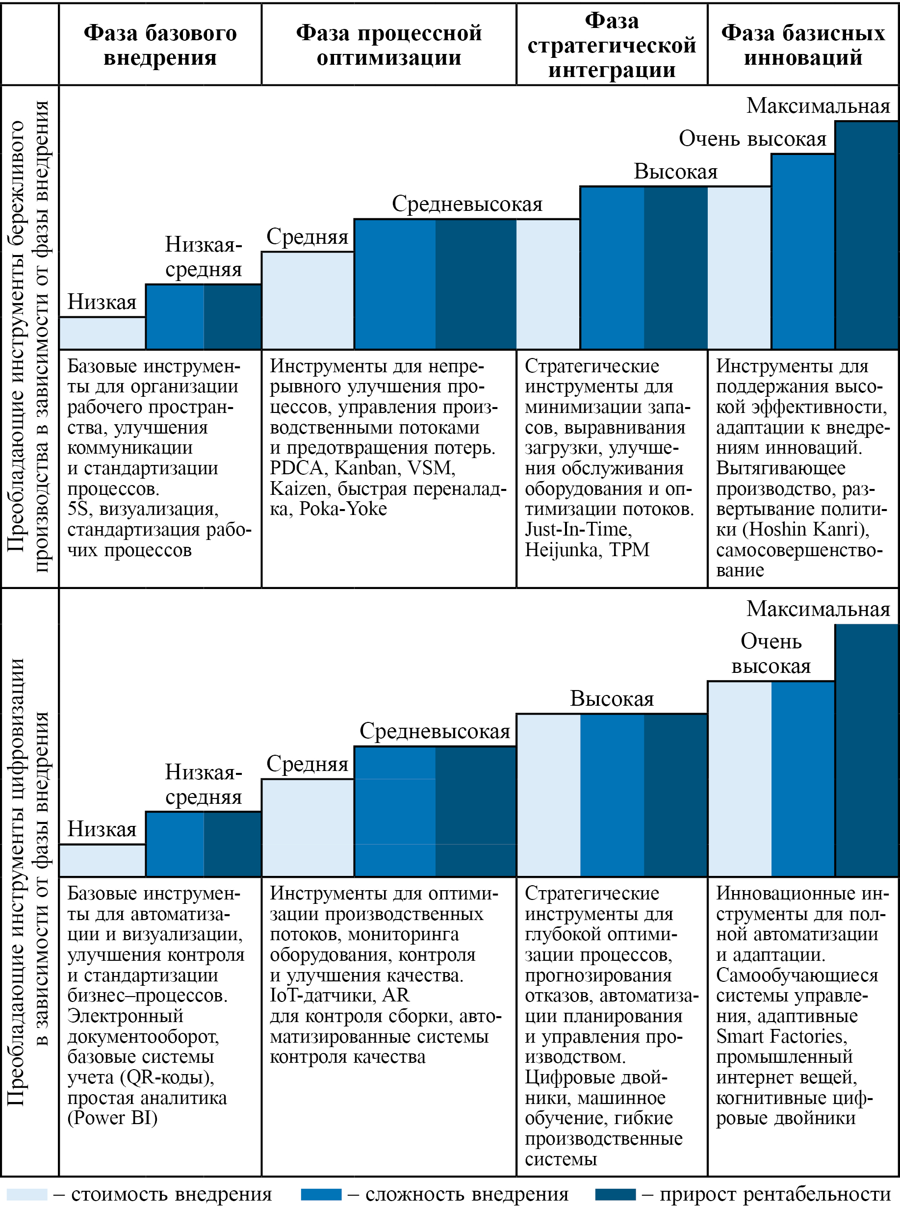 Для преодоления указанных ограничений в настоящем исследовании предложен фазный подход, предполагающий распределение инструментов бережливого производства и цифровизации по этапам зрелости производственной системы. Такой подход базируется на логике эволюционного развития предприятия – от первичной стандартизации и стабилизации процессов до стратегической цифровой трансформации, и внедрения самообучающихся систем управления.