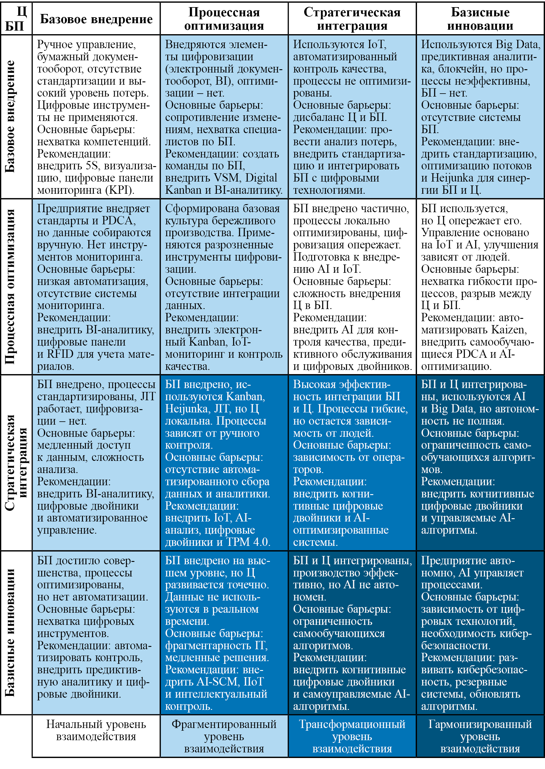 Каждая из 16 ячеек матрицы отражает типовое состояние предприятия, соответствующее различным комбинациям зрелости, и сопровождается аналитическим описанием, выявлением барьеров и рекомендациями по развитию. Такой подход позволяет использовать матрицу не только как инструмент диагностики текущего состояния, но и как основу для планирования стратегически согласованных траекторий трансформации.