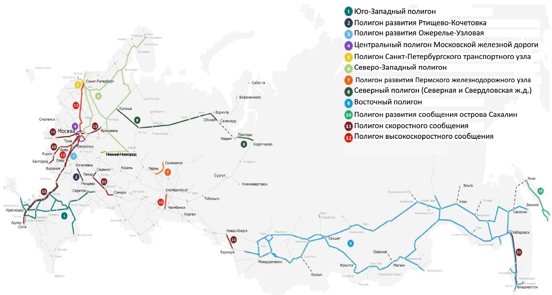 На Рис. 1 показаны концептуальные полигоны российской железнодорожной сети, выделенные авторами по принципу реализации в последние годы приоритетных инвестиционных проектов в рамках национального Комплексного плана модернизации и расширения магистральной инфраструктуры. На каждом из полигонов реализуются локализованные решения по формированию собственных логистических диспетчерских центров управления, работающих непосредственно с железными дорогами, участками, станциями, расположенными в границах полигонов. Впоследствии управление движением в рамках каждого полигона должно быть организовано с применением передовых цифровых технологий (обработка больших данных, цифровое моделирование, платформенные решения, интегрирующие несколько видов транспорта, ключевых участников перевозок грузов).