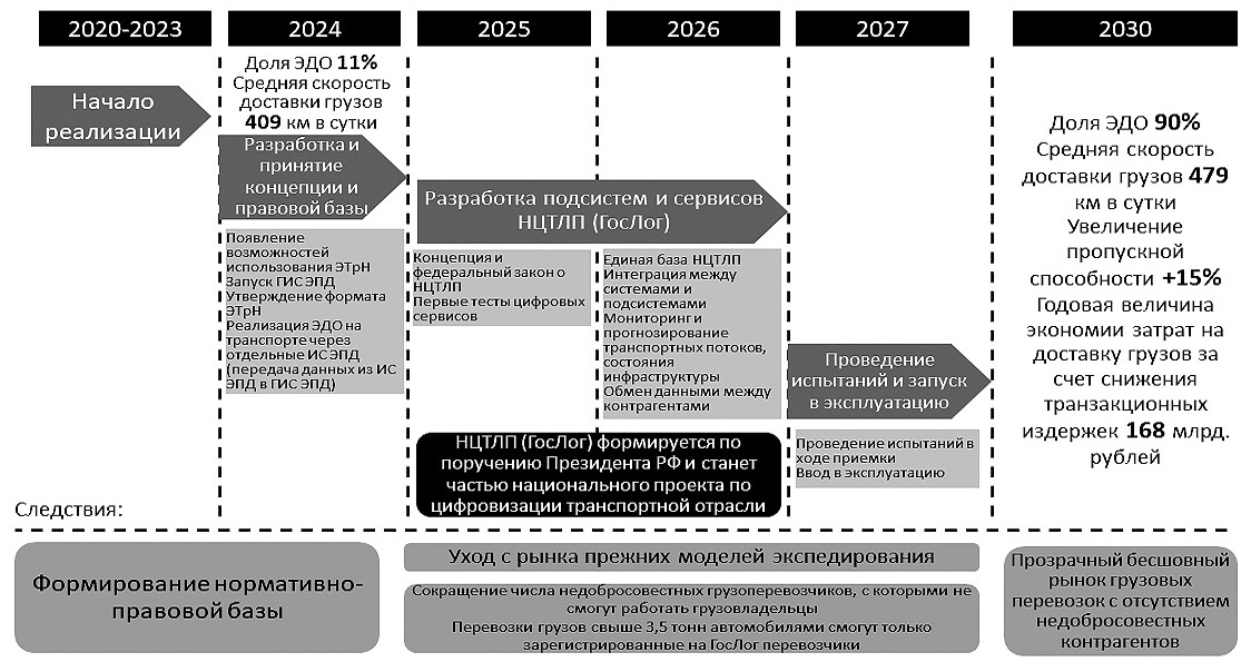Хронологические рамки внедрения НЦТЛП охватывают период 2020–2030 гг. В 2020–2023 гг. прошла подготовка к запуску основного модуля системы – информационной системы «Электронные перевозочные документы»: были разработаны формы электронных документов, проведено тестирование их применения отдельными перевозчиками, государственными компаниями. В 2024 г. согласно решению Правительства РФ [7] запущен эксперимент по созданию, апробации и внедрению информационного механизма НЦТЛП на пилотных площадках, выбранных маршрутах грузоперевозок. В 2025–2026 гг. в систему планируется внедрить цифровые сервисы, провести эксперимент и тестовые испытания оцифрованного взаимодействия участников. С 2026 г. предусмотрен обязательный переход участников грузовых перевозок на юридически значимый обмен электронными документами. Полноценный ввод в эксплуатацию НЦТЛП на всей территории страны ожидается с 2027 г.