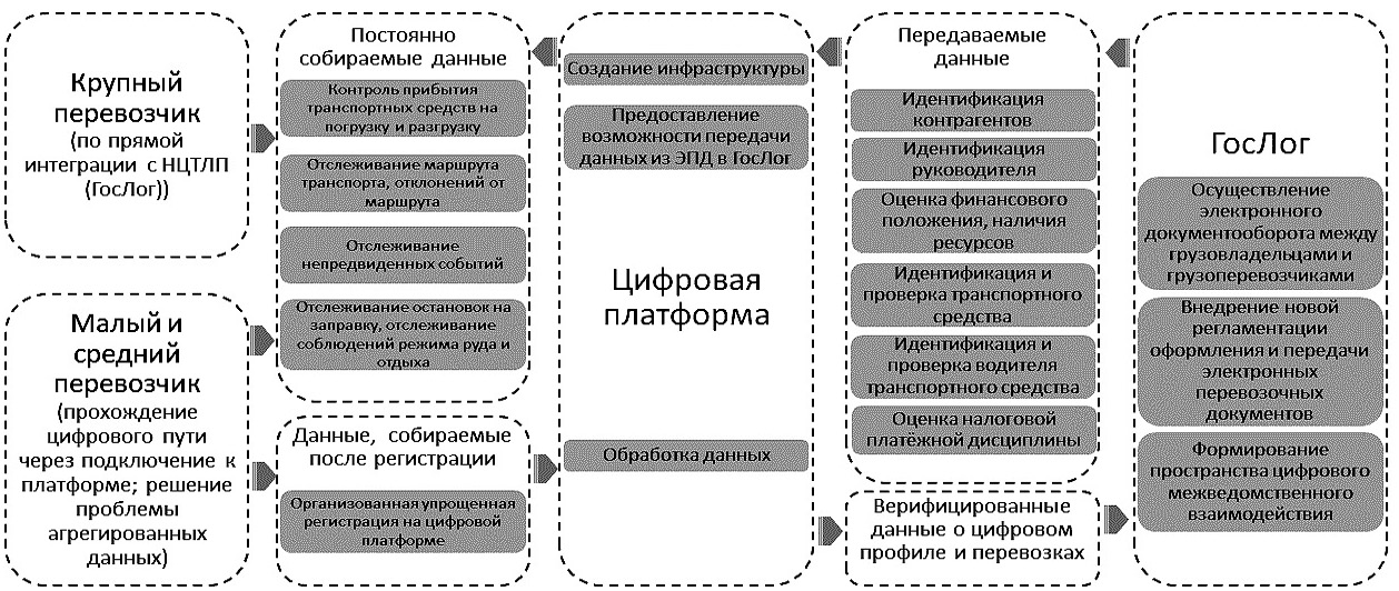 Рис. 2. Концептуальная схема, отражающая результаты аккумулирования, верификации и использования данных о перевозках на площадке единой национальной цифровой платформы