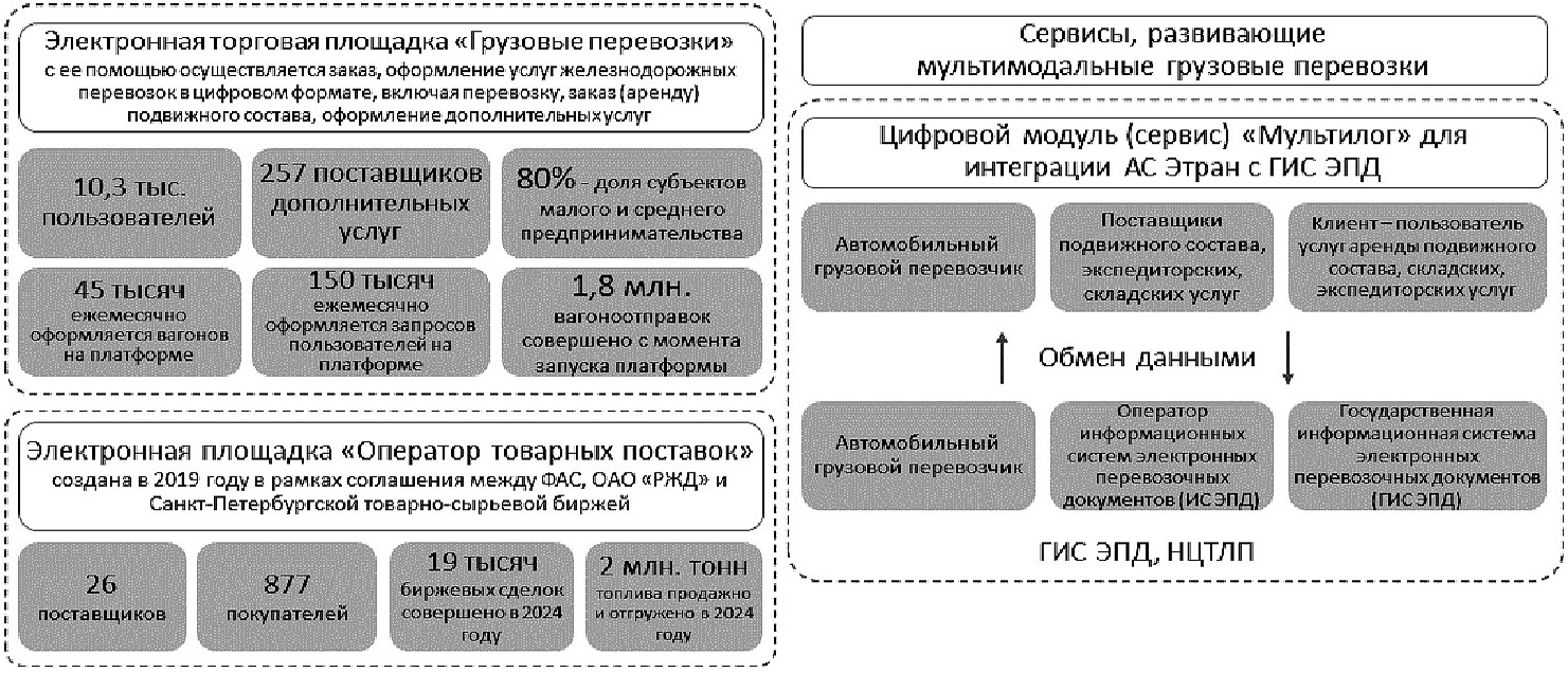 Fig. 3. Elements of the platform ecosystem of Russian railways and statistical indicators of its functioning (as of the end of 2024)