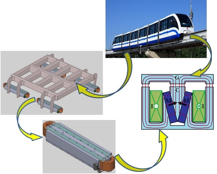 Это дает возможность предложить реализуемую на практике технологию магнитолевитационных транспортных систем (МЛТС). На Рис. 1 схематически показано место ГЭМ в системе подвижного экипажа и неподвижных ферромагнитных направляющих.