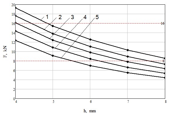 3. Fig. 2. The calculated dependence of the ponderomotor force of attraction of a magnet to a steel plate on the size of the air gap h at different current values: 1st = 13 A, 2nd = 9 A, 3rd = 6 A, 4th = 3 A, 5th = 0 A