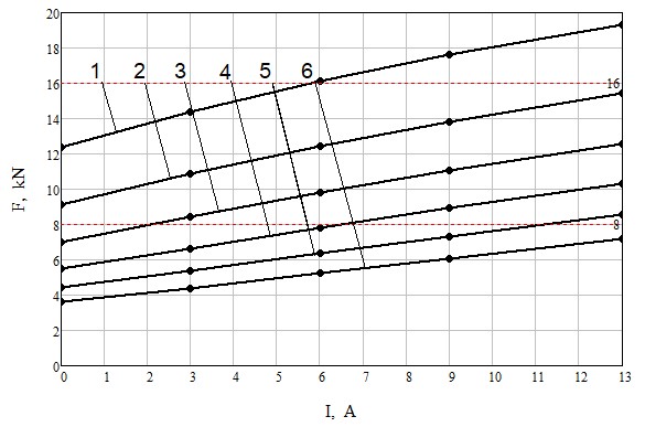 4. Fig. 3. The calculated dependence of the ponderomotor force of attraction of a magnet to a steel plate on the magnitude of the current I at different values of air gaps:1 - h = 4 mm, 2 - h = 5 mm, 3 - h = 6 mm, 4 - h = 7 mm, 5 - h = 8 mm, 6 - h = 9 mm