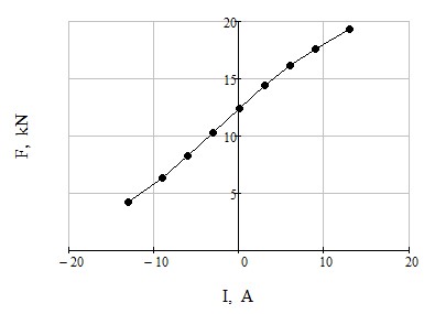 5. Fig. 4. The calculated dependence of the ponderomotor force of attraction of a magnet to a steel plate on the magnitude of the current at an air gap h = 4 mm