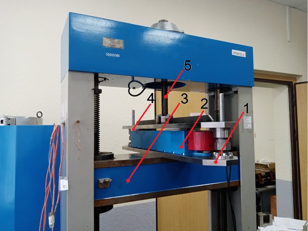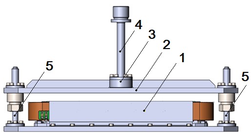 Приспособление (1) магнита (2) закрепляется на плоскости подвижной траверсы испытательной машины (3), оборудованной подъемным механизмом, с помощью которого изменяется зазор между плоскостями полюсов магнита и стальной пластины (4). Стальная пластина толщиной 18 мм крепится стационарно (неподвижно) к вертикальной штанге испытательной машины (5), соединенной с измерительным динамометром (диапазон измерения сил ±100 кН, дискретность измерения – 10 Н). Предполагалось, что стальная пластина (4) при изменении зазора будет скользить по двум направляющим штырям приспособления (1), обеспечивающим соблюдение параллельности плоскости полюсов магнита относительно плоскости пластины (4) при вертикальном перемещении траверсы (3). На Рис. 5 приведен компоновочный вид испытательного приспособления с закрепленным магнитом и стальной пластины, вывешенной на динамометрической штанге.