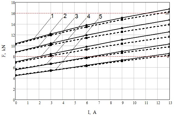 10. Fig. 9. Comparison of the values of the ponderomotor force of the hybrid magnet of JSC "NIIEFA" obtained by mathematical modeling (solid lines) and direct physical measurements using the test machine 1958U-10-1 (dashed lines) for a steel plate with a thickness of 18 mm at different gaps: 1 - h = 4.6 mm, 2 - h = 5.2 mm, 3 - h = 6 mm, 4 - h = 7 mm, 5 - h = 8 mm