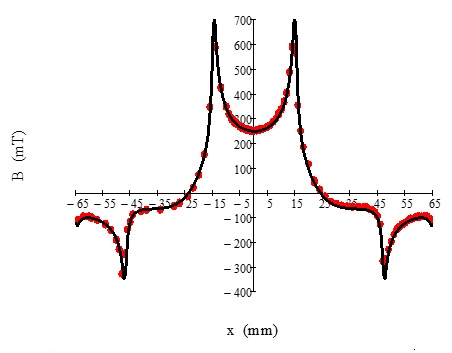 11. Fig. 10. Vertical (normal to the plane of the poles) the induction component measured (points) and calculated (line) at a height y = 0.4 mm from the plane of the poles in the cross section z = 0