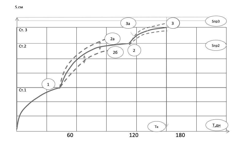 Рис. 1. Этапы консолидации основания насыпи на участке вырезки и замены слабых грунтов. Ст.1 – отсыпка песчаного массива в траншею с погружением на минеральное дно; Ст.2 – глубинное уплотнение песчаного массива; Ст.3 – виброуплотнение верхней зоны; Sпр – проектная осадка; Тк – срок консолидации основания