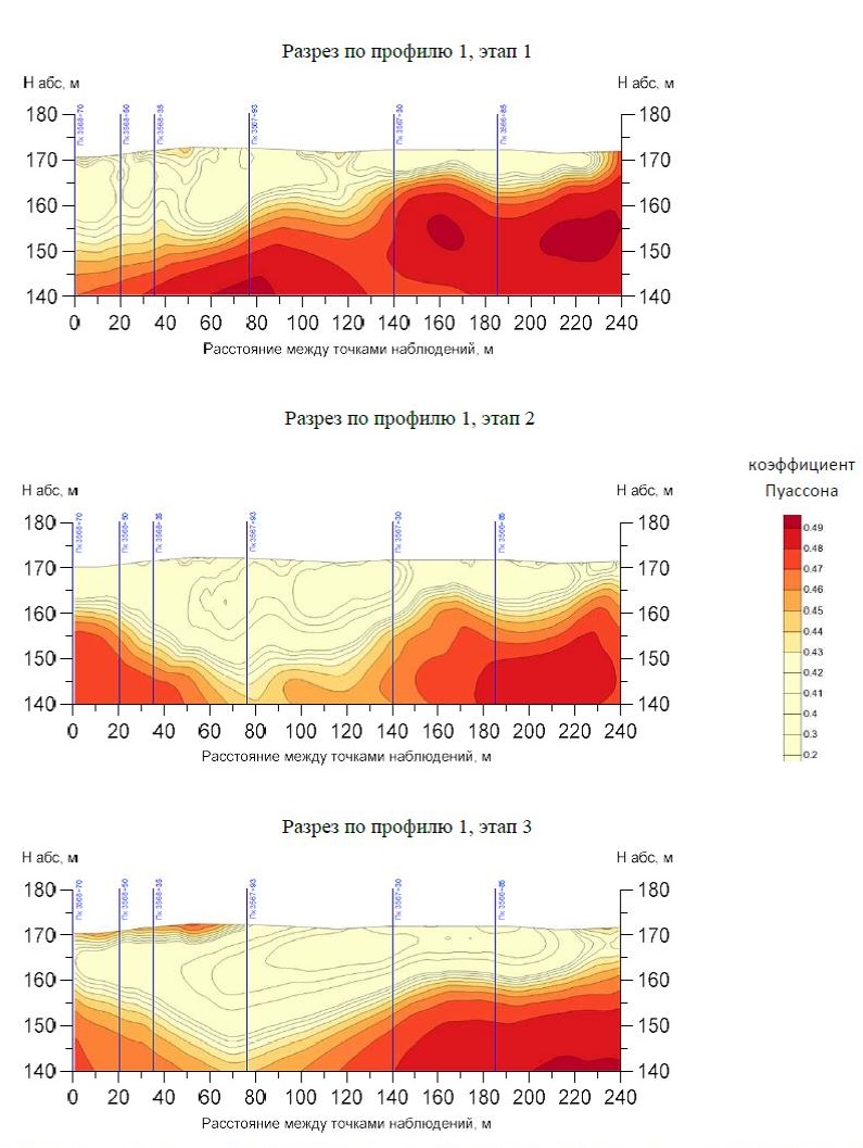 Уплотнение и технологическое регулирование нагрузки последовательно по этапам повышают однородность состава грунтов и стабильность основания под нагрузкой. Для поэтапной оценки изменения литологии массива в каждом разрезе была введена комплексная характеристика – средневзвешеннное значение коэффициента Пуассона: