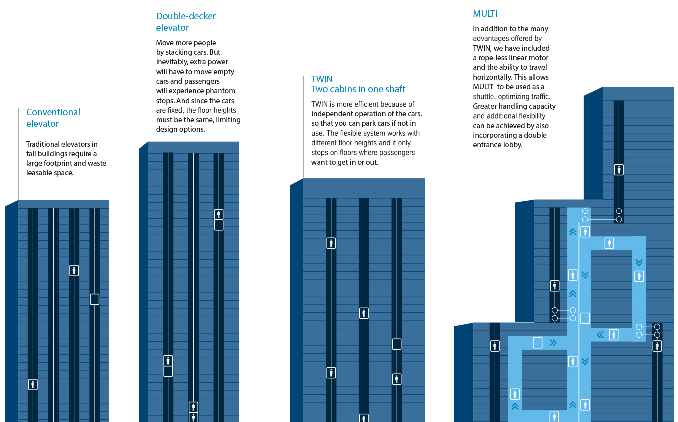 MULTI® represents a completely new and innovative transportation system of thyssenkrupp Elevator [1] - a ropeless elevator that can move through a building not only vertically but also horizontally – a system to revolutionize high building construction. MULTI® in comparison to conventional and modern elevator systems provides to following main benefits (compare Fig. 1):
