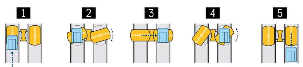 Four exchangers are located at intersections of vertical and horizontal shafts. An exchanger is a direct driven swivel device, which rotates the sledge including the linear motor, while the cabin remains vertical by an interlock. In horizontal position the linear motor now drives the car horizontally to the next exchanger, where the sledge is turned back in vertical direction. Herewith a transition from a vertical to a horizontal shaft and vice versa is realized. The principle is shown in Fig. 4.