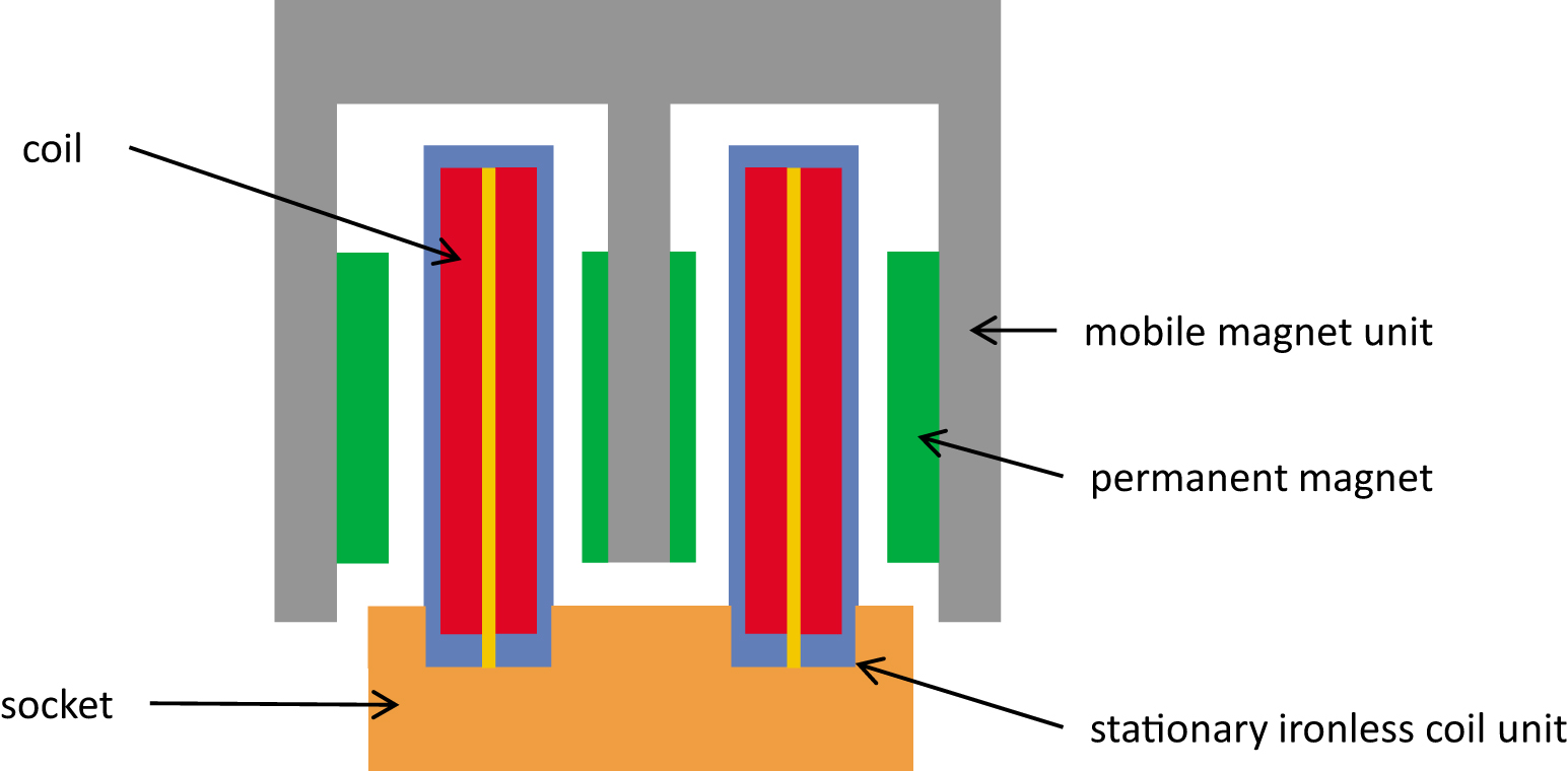 An ironless long-stator linear synchronous motor concept is applied. The primary part consists of multiple coil units in double array configuration placed along the shaft. The secondary part is a permanent magnet yoke fixed at the car. Fig. 5 shows the configuration. Compact, IGBT-based inverter units (motor controllers) are distributed along the shafts. Each motor controller drives a 3-phase current to a dedicated coil unit. In double array configuration, eight motor controllers and coil units act on a single car.