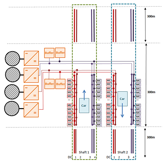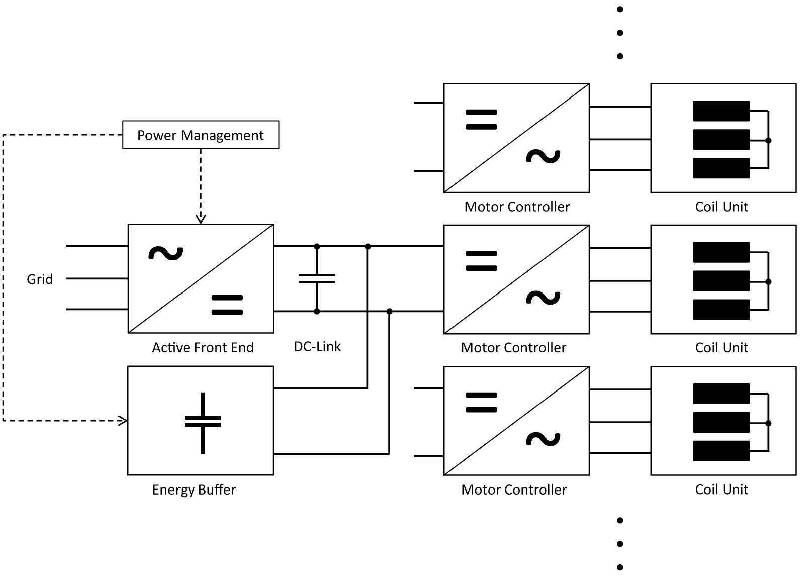 At Testtower Rottweil the MULTI® demonstrator has four independent power supplies. Herewith a fourfold redundancy is achieved. The power supplies consists of bidirectional rectifiers (active front ends), which feed DC-power to busbars, distributed along each elevator shaft. The DC-based system offers a higher efficiency and requires less space inside the shaft when compared to an AC-system. Motor controllers controlling coil units are supplied from these busbars. The coil units are generating the mechanical force through a yoke which is equipped with permanent magnets. The yoke is mechanically connected to an elevator car.