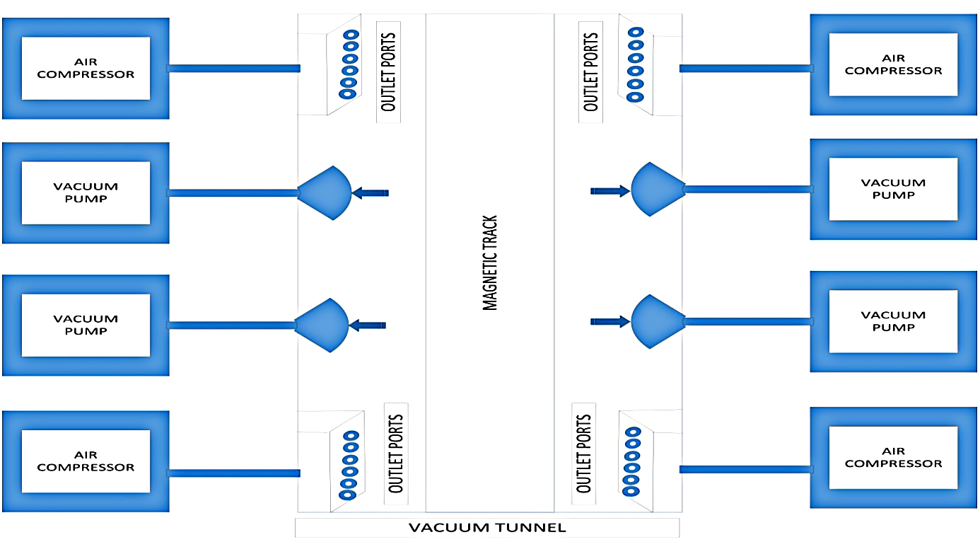 Here outlet ports, as shown in Fig. 1, are the part of the air compressor to transfer compressed air to vehicle. And in Fig. 1 magnetic track is the track on which vehicle will levitate and move.