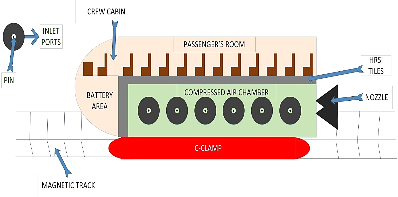 In Fig. 3, we have explained the basic components of a vehicle such as battery area, crew cabin and passengers’ room. And here we have also used high reusable silicon insulation (HRSI) tiles as it does not allow heat transfer in passenger sitting area for safe journey. Here C-clamp is the base of the vehicle, which makes vehicle levitate above the magnetic track. Here compressed air chamber is the closed chamber in which compressed air is filled. Here inlet ports are shown which are used to fill compressed air chamber with compressed air.
