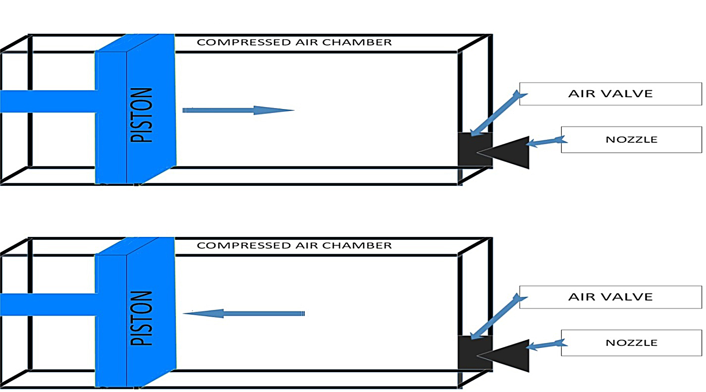 Now we will discuss the mechanism of motion of vehicle in forward direction. The outlet ports, as shown in Fig. 1, will transfer compressed air to inlet ports, as shown in Fig. 3, of the vehicle. As the pin, as shown in Fig. 3, gets pushed inside, the entry of compressed air into compressed air chamber starts. This charging of compressed air chamber is done when the vehicle is in rest. See Fig. 4 (2D view of chamber), as compressed air gets inside compressed air chamber, it accumulates until the chamber is full, and then we will release compressed air with the help of valve as shown in Fig. 4(a) and Fig. 4(b), and to enhance effect we have used nozzle which will allow releasing compressed air. As we need a constant pressure throughout exit of the compressed air, we have used a piston. Fig. 4(a) and Fig. 4(b) represent forward and backward motion of piston. And when compressed air comes out from compressed air chamber via nozzle in control of valve with constant pressure, it provides a huge reaction force which will accelerate our vehicle in opposite direction of the air coming out. Once it gets a required velocity, the valves will be shut off by the command from crew cabin, as shown in Fig. 3, and hence the vehicle will maintain its velocity as it will be in the environment of negligible friction. Compressed air chamber should be made in such a way that it can tolerate high temperature and high pressure.