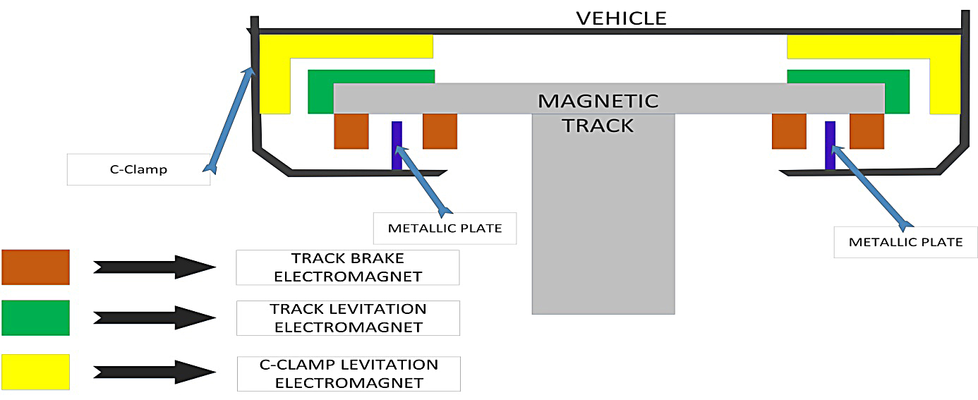These C-clamp levitation electromagnets of C-clamp and track brake electromagnets of the magnetic track both generate similar poles and develop repulsive force during the normal position of the vehicle. The repulsive force is developed in such a manner that the vehicle loses its contact with the magnetic track and it starts levitating above the magnetic track. If the weight of the vehicle changes then intensity of these electromagnets also changes accordingly automatically.