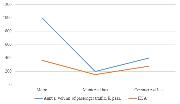 An example of IICA calculation for all alternative modes of passenger transportation, which implemented at the considered direction, represented at Table 2. An example of comparison of annual passenger traffic volume and IICA, represented at Table 2, by modes of passenger transportation, which implemented at considered direction, shown at Fig. The picture illustrates the dependency of passenger traffic volume from IICA.