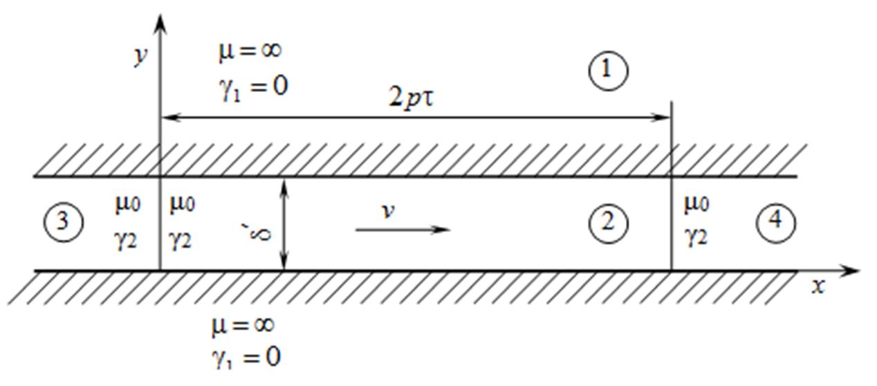Одномерная теория ДЛАД базируется на расчетной модели, представленной на Рис. 2, и ряде упрощающих допущений: активная поверхность индуктора гладкая, обмотка реального индуктора, расположенная в пазах, представлена токовым слоем, распределенным по поверхности индуктора и образующим бегущую в продольном (вдоль оси ОХ) направлении волну; магнитная проницаемость сердечников бесконечно большая и их насыщение отсутствует; электропроводность сердечников не учитывается, сердечники индукторов имеют бесконечную протяженность по продольной (Х) и поперечной (Z) координатам, а продольный краевой эффект является следствием лишь ограниченной длины поверхностного токового слоя индуктора; вторичный элемент представляет собой изотропную проводящую немагнитную среду и заполняет все межиндукторное пространство.